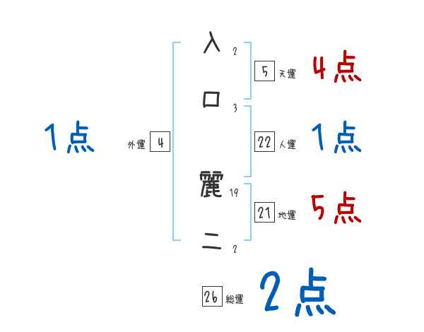 人運![]() | 入口麗二さんの人運は22画の1つ星!努力することが苦手ないっぽう手先が器用。芸術性にも優れる。 性格や才能などを表す2番目に重要な運勢です。人間関係や協調性、社会的な成功に影響します。主に20歳から50歳ぐらいまでの中年期の運勢を表します。 |