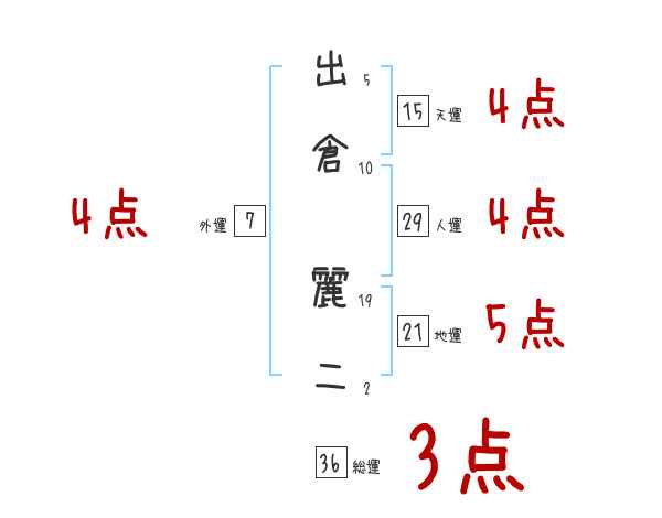 外運![]() | 出倉麗二さんの外運は7画の4つ星!強い意志や信念を持ち独立心が強い。自立する。 生活面を象徴する運勢です。外部から受ける影響力を表し、結婚運、家庭運や職場、環境への順応性を表します。 |