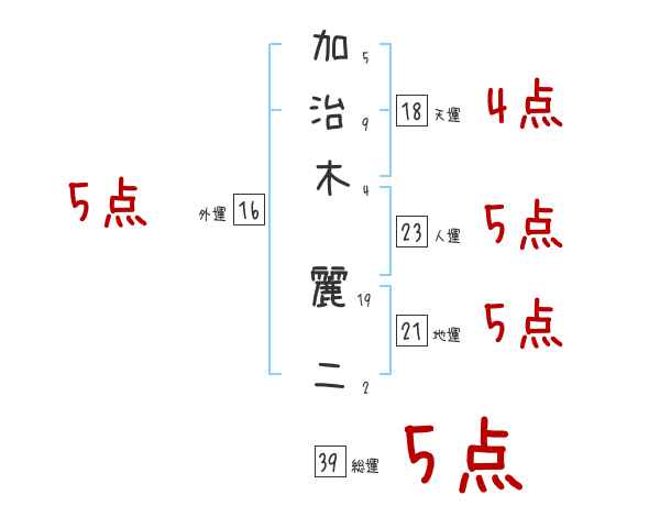 人運![]() | 加治木麗二さんの人運は23画の5つ星!想像力に優れ活力がある。一代で成功し名誉を手に入れる。 性格や才能などを表す2番目に重要な運勢です。人間関係や協調性、社会的な成功に影響します。主に20歳から50歳ぐらいまでの中年期の運勢を表します。 |
