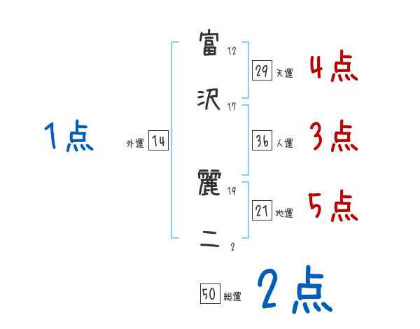 天運![]() | 富沢麗二さんの天運は29画の4つ星!完全主義で才能がある。厳格な心の持ち主。 家系が持つ宿命的な運勢を表します。祖先から受け継いだ苗字ですので自分の力が及びません。家柄を象徴します。 |