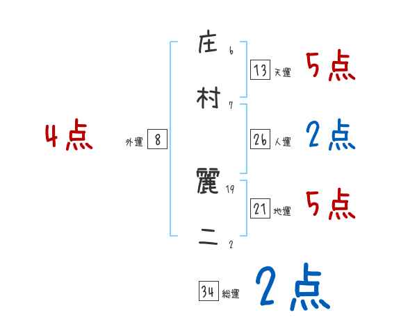 庄村麗二さんの画数の鑑定結果