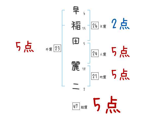 総運![]() | 早稲田麗二さんの総運は47画の5つ星!実力が開花し発展する円満な人生。財に恵まれる。 あなたの人生を表す1番重要な運勢です。生涯を通じて影響する総合運となり、主に50歳以降の晩年期に影響を及ぼします。 |
