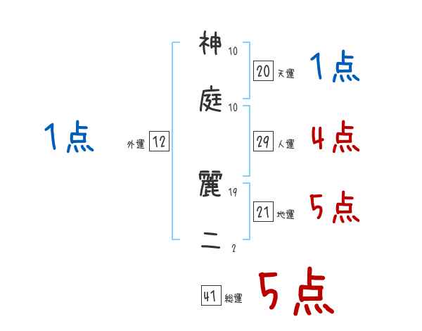 地運![]() | 神庭麗二さんの地運は21画の5つ星!統率力がある。独立し成功する。名誉を手に入れる。 個性を表す基礎的な運勢です。性格形成や対人関係、行動力など家庭環境に影響されます。主に誕生してから20歳くらいまでの若年期の運勢を表します。 |