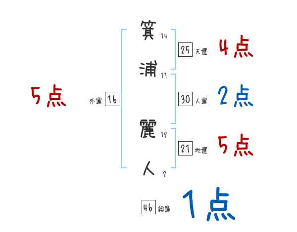 天運![]() | 箕浦麗人さんの天運は25画の4つ星!個性があり才能があふれる。強運の持ち主で発展する。 家系が持つ宿命的な運勢を表します。祖先から受け継いだ苗字ですので自分の力が及びません。家柄を象徴します。 |