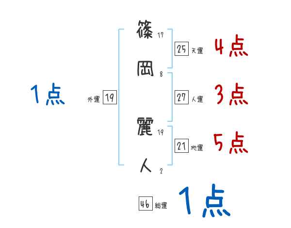 総運![]() | 篠岡麗人さんの総運は46画の1つ星!迷走することが多く苦労するかも。目先のことにとらわれないように。 あなたの人生を表す1番重要な運勢です。生涯を通じて影響する総合運となり、主に50歳以降の晩年期に影響を及ぼします。 |