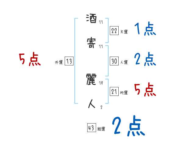 外運![]() | 酒寄麗人さんの外運は13画の5つ星!才能に恵まれ人気がある。名声を手に入れる。円満な人生。 生活面を象徴する運勢です。外部から受ける影響力を表し、結婚運、家庭運や職場、環境への順応性を表します。 |