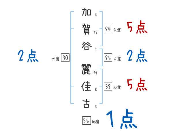 天運![]() | 加賀谷麗佳古さんの天運は24画の5つ星!家庭運が良く順調な人生。金運にも恵まれる。 家系が持つ宿命的な運勢を表します。祖先から受け継いだ苗字ですので自分の力が及びません。家柄を象徴します。 |