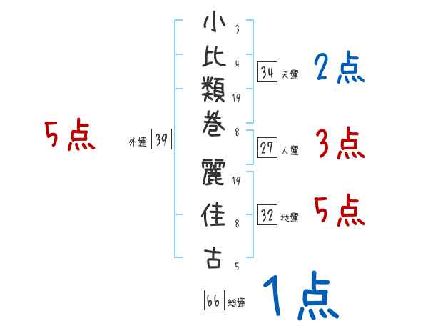 外運![]() | 小比類巻麗佳古さんの外運は39画の5つ星!社交性に優れ人望が厚い。人の上に立ち成功する。 生活面を象徴する運勢です。外部から受ける影響力を表し、結婚運、家庭運や職場、環境への順応性を表します。 |