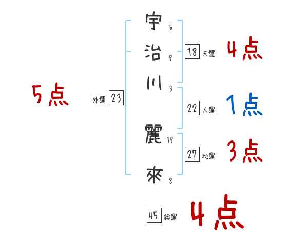 天運![]() | 宇治川麗來さんの天運は18画の4つ星!情熱的で剛気。忍耐力があり信頼される。 家系が持つ宿命的な運勢を表します。祖先から受け継いだ苗字ですので自分の力が及びません。家柄を象徴します。 |