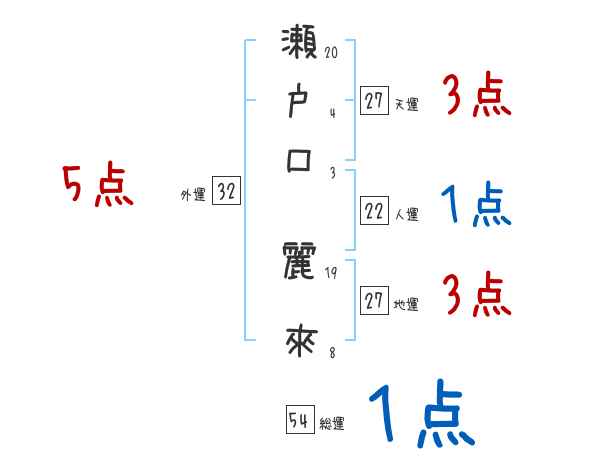外運![]() | 瀬戸口麗來さんの外運は32画の5つ星!柔軟性があり成功する。チャンスが多く金運が良い。 生活面を象徴する運勢です。外部から受ける影響力を表し、結婚運、家庭運や職場、環境への順応性を表します。 |