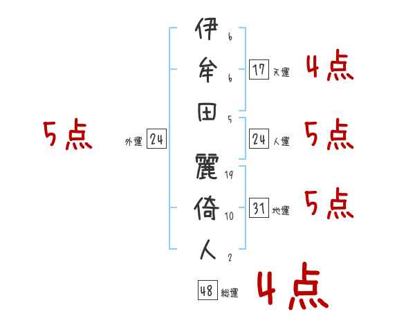 外運![]() | 伊牟田麗倚人さんの外運は24画の5つ星!家庭運が良く順調な人生。金運にも恵まれる。 生活面を象徴する運勢です。外部から受ける影響力を表し、結婚運、家庭運や職場、環境への順応性を表します。 |