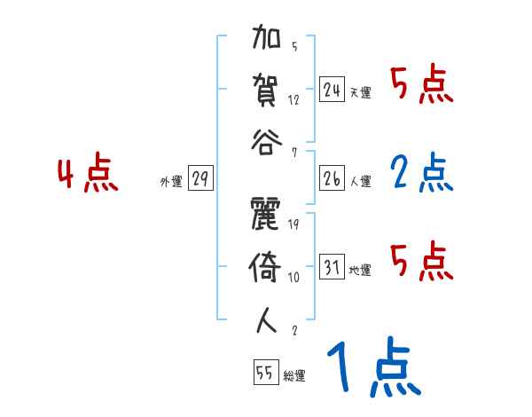 地運![]() | 加賀谷麗倚人さんの地運は31画の5つ星!社交性があり判断力に優れる。順風満帆な人生で円満な生活。 個性を表す基礎的な運勢です。性格形成や対人関係、行動力など家庭環境に影響されます。主に誕生してから20歳くらいまでの若年期の運勢を表します。 |