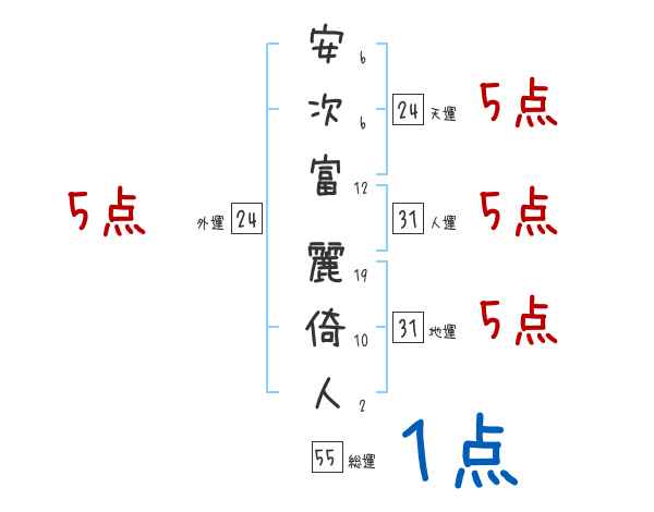 天運![]() | 安次富麗倚人さんの天運は24画の5つ星!家庭運が良く順調な人生。金運にも恵まれる。 家系が持つ宿命的な運勢を表します。祖先から受け継いだ苗字ですので自分の力が及びません。家柄を象徴します。 |