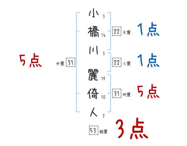 総運![]() | 小橋川麗倚人さんの総運は53画の3つ星!やや見栄っ張りで虚栄心がある。散財に注意。 あなたの人生を表す1番重要な運勢です。生涯を通じて影響する総合運となり、主に50歳以降の晩年期に影響を及ぼします。 |