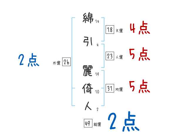 人運![]() | 綿引麗倚人さんの人運は23画の5つ星!想像力に優れ活力がある。一代で成功し名誉を手に入れる。 性格や才能などを表す2番目に重要な運勢です。人間関係や協調性、社会的な成功に影響します。主に20歳から50歳ぐらいまでの中年期の運勢を表します。 |