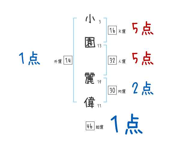 人運![]() | 小園麗偉さんの人運は32画の5つ星!柔軟性があり成功する。チャンスが多く金運が良い。 性格や才能などを表す2番目に重要な運勢です。人間関係や協調性、社会的な成功に影響します。主に20歳から50歳ぐらいまでの中年期の運勢を表します。 |