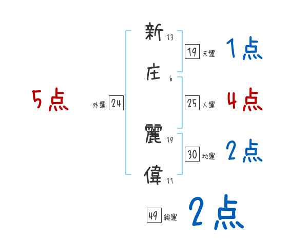 外運![]() | 新庄麗偉さんの外運は24画の5つ星!家庭運が良く順調な人生。金運にも恵まれる。 生活面を象徴する運勢です。外部から受ける影響力を表し、結婚運、家庭運や職場、環境への順応性を表します。 |