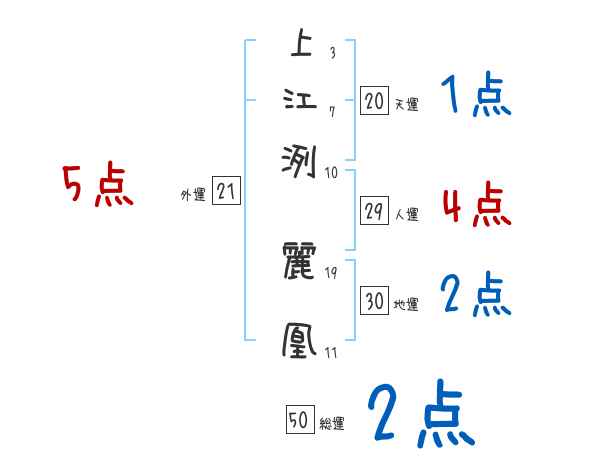 外運![]() | 上江洌麗凰さんの外運は21画の5つ星!統率力がある。独立し成功する。名誉を手に入れる。 生活面を象徴する運勢です。外部から受ける影響力を表し、結婚運、家庭運や職場、環境への順応性を表します。 |