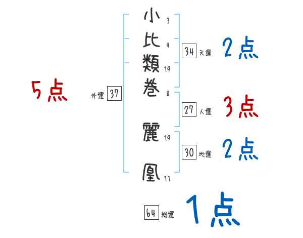 人運![]() | 小比類巻麗凰さんの人運は27画の3つ星!頭脳明晰だが強情で摩擦が多い傾向。孤立に注意。 性格や才能などを表す2番目に重要な運勢です。人間関係や協調性、社会的な成功に影響します。主に20歳から50歳ぐらいまでの中年期の運勢を表します。 |