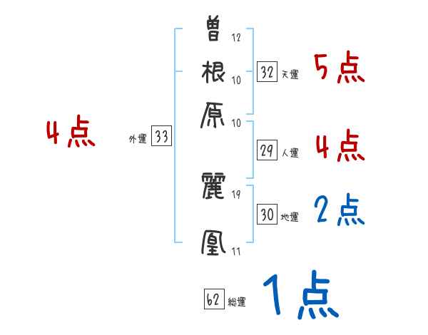 天運![]() | 曽根原麗凰さんの天運は32画の5つ星!柔軟性があり成功する。チャンスが多く金運が良い。 家系が持つ宿命的な運勢を表します。祖先から受け継いだ苗字ですので自分の力が及びません。家柄を象徴します。 |