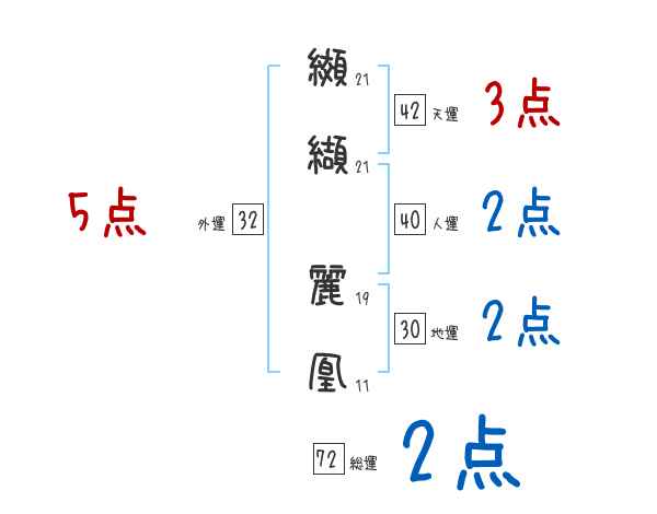 外運![]() | 纐纈麗凰さんの外運は32画の5つ星!柔軟性があり成功する。チャンスが多く金運が良い。 生活面を象徴する運勢です。外部から受ける影響力を表し、結婚運、家庭運や職場、環境への順応性を表します。 |