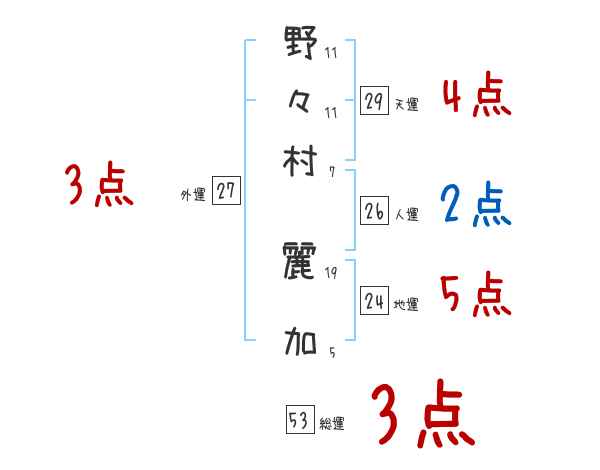 総運![]() | 野々村麗加さんの総運は53画の3つ星!やや見栄っ張りで虚栄心がある。散財に注意。 あなたの人生を表す1番重要な運勢です。生涯を通じて影響する総合運となり、主に50歳以降の晩年期に影響を及ぼします。 |