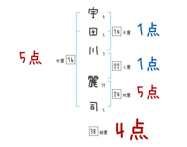 外運![]() | 宇田川麗司さんの外運は16画の5つ星!人望が厚く大きく発展する。逆転成功が見える。 生活面を象徴する運勢です。外部から受ける影響力を表し、結婚運、家庭運や職場、環境への順応性を表します。 |