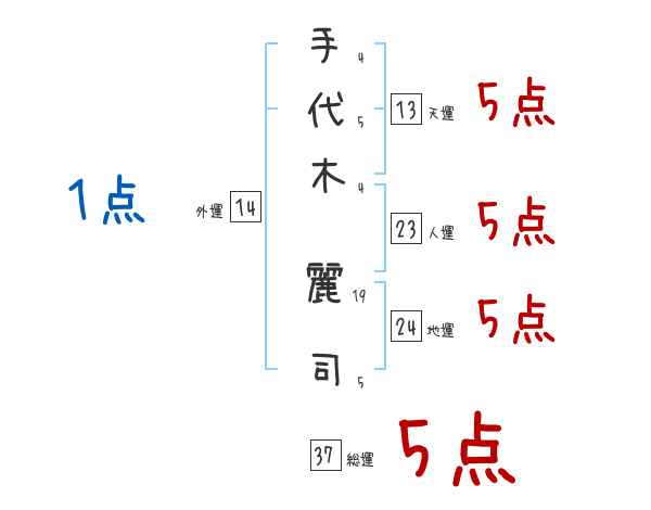 総運![]() | 手代木麗司さんの総運は37画の5つ星!努力家で順応性に優れる。現実的な考え方ができ忠実に物事をこなす。 あなたの人生を表す1番重要な運勢です。生涯を通じて影響する総合運となり、主に50歳以降の晩年期に影響を及ぼします。 |