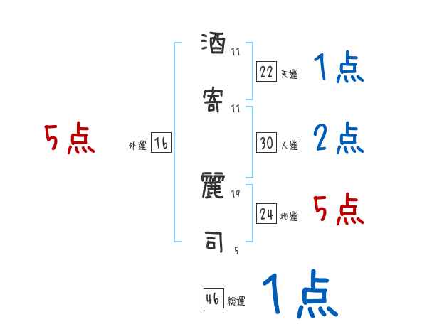 外運![]() | 酒寄麗司さんの外運は16画の5つ星!人望が厚く大きく発展する。逆転成功が見える。 生活面を象徴する運勢です。外部から受ける影響力を表し、結婚運、家庭運や職場、環境への順応性を表します。 |