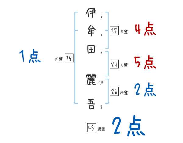 天運![]() | 伊牟田麗吾さんの天運は17画の4つ星!積極的な行動力。地位を気づき財産を手に入れる。純粋な心と直感力。 家系が持つ宿命的な運勢を表します。祖先から受け継いだ苗字ですので自分の力が及びません。家柄を象徴します。 |