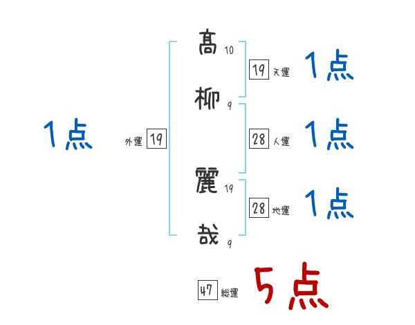 人運![]() | 髙柳麗哉さんの人運は28画の1つ星!家庭環境に注意。スポーツで活躍できる能力があるかも。 性格や才能などを表す2番目に重要な運勢です。人間関係や協調性、社会的な成功に影響します。主に20歳から50歳ぐらいまでの中年期の運勢を表します。 |