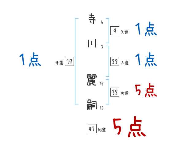 天運![]() | 寺川麗嗣さんの天運は9画の1つ星!消極的で才能を発揮することが苦手なことも。周りの意見に耳を傾けましょう。 家系が持つ宿命的な運勢を表します。祖先から受け継いだ苗字ですので自分の力が及びません。家柄を象徴します。 |