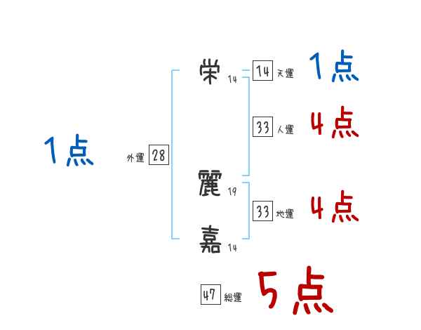 総運![]() | 栄麗嘉さんの総運は47画の5つ星!実力が開花し発展する円満な人生。財に恵まれる。 あなたの人生を表す1番重要な運勢です。生涯を通じて影響する総合運となり、主に50歳以降の晩年期に影響を及ぼします。 |