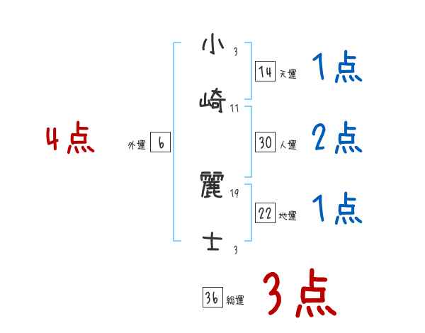 総運![]() | 小崎麗士さんの総運は36画の3つ星!先見性が豊かです。多少神経質で苦労することも。 あなたの人生を表す1番重要な運勢です。生涯を通じて影響する総合運となり、主に50歳以降の晩年期に影響を及ぼします。 |