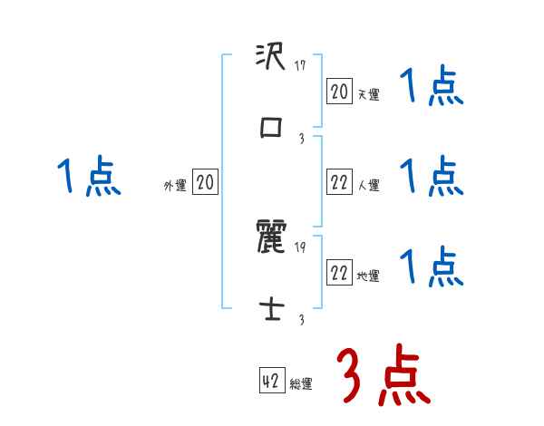 総運![]() | 沢口麗士さんの総運は42画の3つ星!病気に注意。多芸であるが消極的でおとなしい。 あなたの人生を表す1番重要な運勢です。生涯を通じて影響する総合運となり、主に50歳以降の晩年期に影響を及ぼします。 |