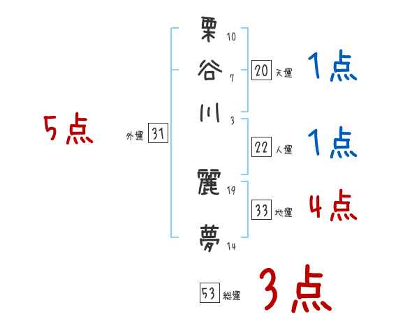総運![]() | 栗谷川麗夢さんの総運は53画の3つ星!やや見栄っ張りで虚栄心がある。散財に注意。 あなたの人生を表す1番重要な運勢です。生涯を通じて影響する総合運となり、主に50歳以降の晩年期に影響を及ぼします。 |