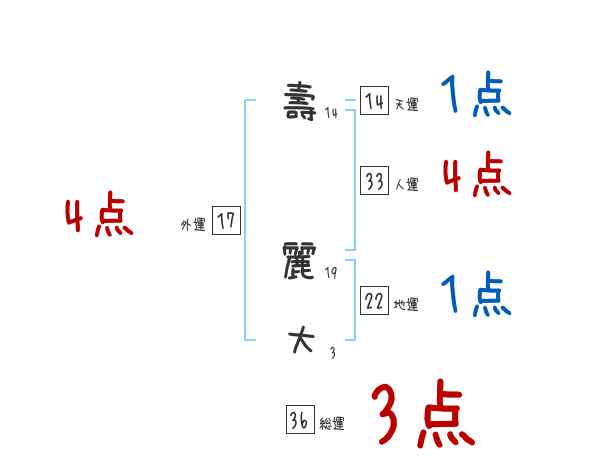 天運![]() | 壽麗大さんの天運は14画の1つ星!人に対して優しいがストレスを溜め込みがち。人間関係のトラブルを避けるよう気をつけましょう。 家系が持つ宿命的な運勢を表します。祖先から受け継いだ苗字ですので自分の力が及びません。家柄を象徴します。 |
