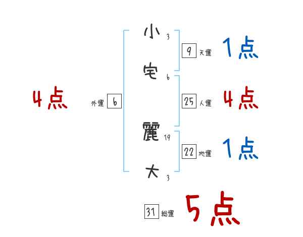 天運![]() | 小宅麗大さんの天運は9画の1つ星!消極的で才能を発揮することが苦手なことも。周りの意見に耳を傾けましょう。 家系が持つ宿命的な運勢を表します。祖先から受け継いだ苗字ですので自分の力が及びません。家柄を象徴します。 |
