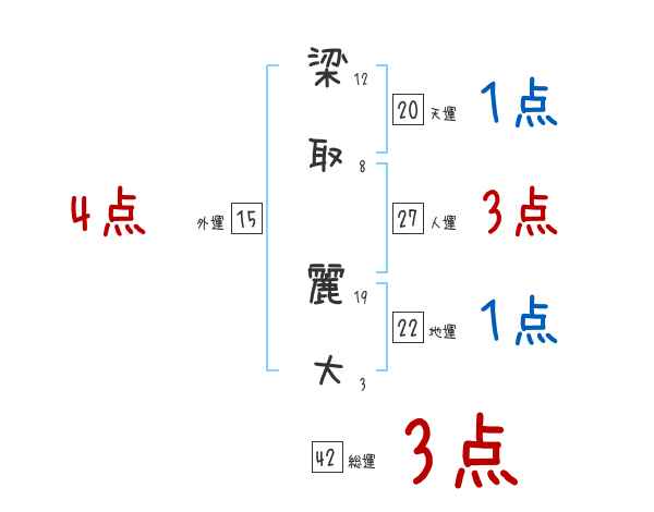 総運![]() | 梁取麗大さんの総運は42画の3つ星!病気に注意。多芸であるが消極的でおとなしい。 あなたの人生を表す1番重要な運勢です。生涯を通じて影響する総合運となり、主に50歳以降の晩年期に影響を及ぼします。 |