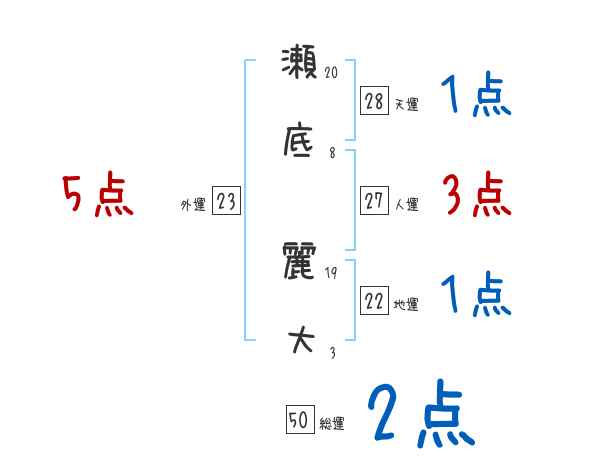 天運![]() | 瀬底麗大さんの天運は28画の1つ星!家庭環境に注意。スポーツで活躍できる能力があるかも。 家系が持つ宿命的な運勢を表します。祖先から受け継いだ苗字ですので自分の力が及びません。家柄を象徴します。 |