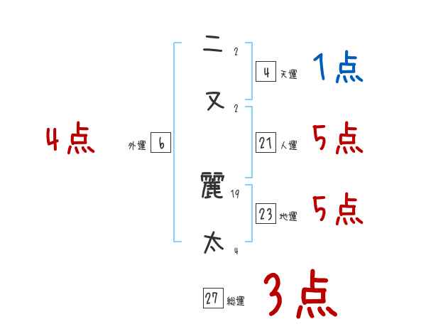 天運![]() | 二又麗太さんの天運は4画の1つ星!感情が不安定で苦労するかも。周囲との協調を心掛けましょう。 家系が持つ宿命的な運勢を表します。祖先から受け継いだ苗字ですので自分の力が及びません。家柄を象徴します。 |