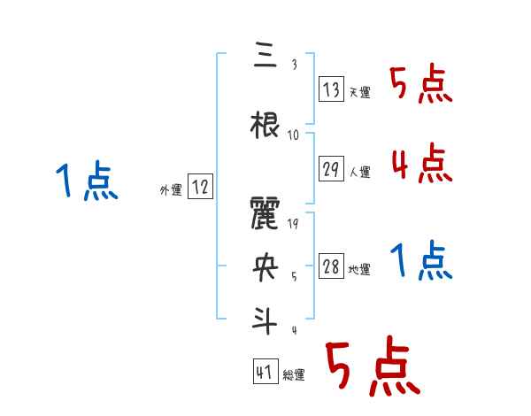 天運![]() | 三根麗央斗さんの天運は13画の5つ星!才能に恵まれ人気がある。名声を手に入れる。円満な人生。 家系が持つ宿命的な運勢を表します。祖先から受け継いだ苗字ですので自分の力が及びません。家柄を象徴します。 |