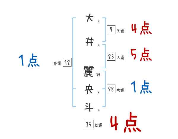 地運![]() | 大井麗央斗さんの地運は28画の1つ星!家庭環境に注意。スポーツで活躍できる能力があるかも。 個性を表す基礎的な運勢です。性格形成や対人関係、行動力など家庭環境に影響されます。主に誕生してから20歳くらいまでの若年期の運勢を表します。 |