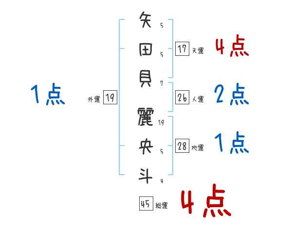 総運![]() | 矢田貝麗央斗さんの総運は45画の4つ星!もくもくと物事を進め達成する。地味な努力家。 あなたの人生を表す1番重要な運勢です。生涯を通じて影響する総合運となり、主に50歳以降の晩年期に影響を及ぼします。 |
