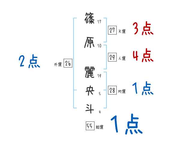 外運![]() | 篠原麗央斗さんの外運は26画の2つ星!波瀾万丈かも。信頼できる人を大事にしましょう。 生活面を象徴する運勢です。外部から受ける影響力を表し、結婚運、家庭運や職場、環境への順応性を表します。 |