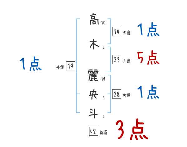 総運![]() | 高木麗央斗さんの総運は42画の3つ星!病気に注意。多芸であるが消極的でおとなしい。 あなたの人生を表す1番重要な運勢です。生涯を通じて影響する総合運となり、主に50歳以降の晩年期に影響を及ぼします。 |