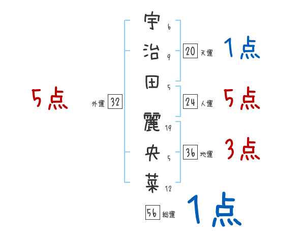 外運![]() | 宇治田麗央菜さんの外運は32画の5つ星!柔軟性があり成功する。チャンスが多く金運が良い。 生活面を象徴する運勢です。外部から受ける影響力を表し、結婚運、家庭運や職場、環境への順応性を表します。 |