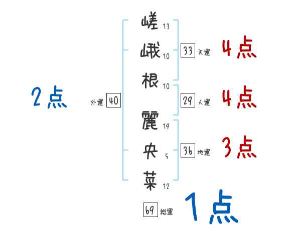 総運![]() | 嵯峨根麗央菜さんの総運は69画の1つ星!不満を感じやすい傾向が。ストレスを貯めないように注意しましょう。 あなたの人生を表す1番重要な運勢です。生涯を通じて影響する総合運となり、主に50歳以降の晩年期に影響を及ぼします。 |