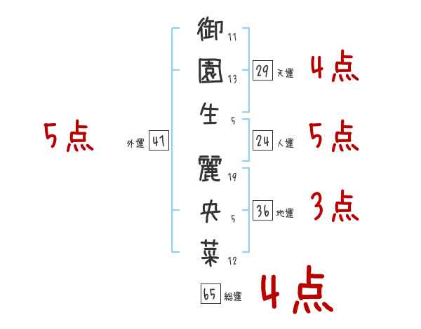 総運![]() | 御園生麗央菜さんの総運は65画の4つ星!幸運に恵まれ繁栄する。包容力がある。 あなたの人生を表す1番重要な運勢です。生涯を通じて影響する総合運となり、主に50歳以降の晩年期に影響を及ぼします。 |