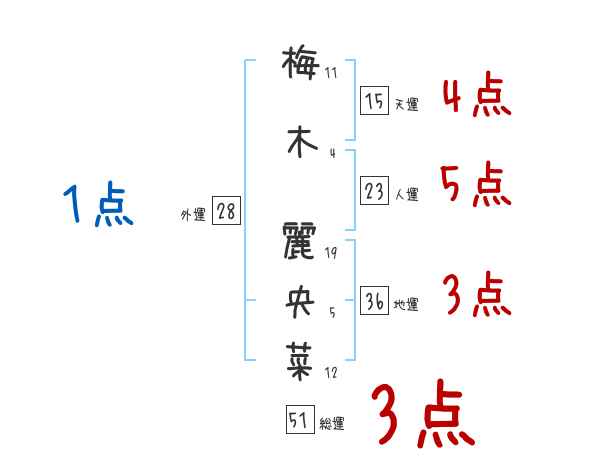 外運![]() | 梅木麗央菜さんの外運は28画の1つ星!家庭環境に注意。スポーツで活躍できる能力があるかも。 生活面を象徴する運勢です。外部から受ける影響力を表し、結婚運、家庭運や職場、環境への順応性を表します。 |